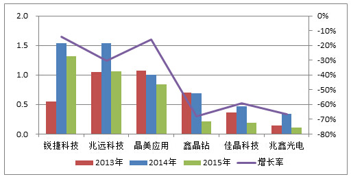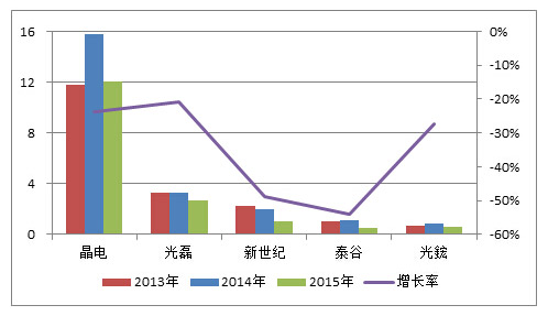 GGII: 三季度臺灣LED市場衰退明顯,市場回暖或為妄想來源:中圖科技 發(fā)布時間:2015-10-23 點擊:4787 次摘要:臺灣LED藍(lán)寶石、芯片及封裝市場三季度業(yè)績下滑幅度均超過23%,相比第一和第二季度,下滑明顯加快。2015年年中,市場曾預(yù)測臺灣LED市場下半年會逐漸回暖,訂單會明顯增加,從目前各企業(yè)交出的業(yè)績報告來看,市場并未出現(xiàn)預(yù)料中的回暖,反而呈現(xiàn)加速下滑的趨勢。 【高工LED專稿】 【文/GGII】高工產(chǎn)研LED研究所(GGII)統(tǒng)計數(shù)據(jù)顯示,2015年三季度,臺灣6家藍(lán)寶石基板上市企業(yè)總營收3.75億元(單位:人民幣,下同),同比減少32.7%,環(huán)比減少25.1%;5家芯片上市企業(yè)(璨圓自8月起不再公開發(fā)行)總營收16.86億元,同比減少27%,環(huán)比減少13.6;10家LED封裝上市企業(yè)總營收31.65億元,同比減少23%,環(huán)比減少8%。 臺灣LED藍(lán)寶石、芯片及封裝市場三季度業(yè)績下滑幅度均超過23%,相比第一和第二季度,下滑明顯加快。2015年年中,市場曾預(yù)測臺灣LED市場下半年會逐漸回暖,訂單會明顯增加,從目前各企業(yè)交出的業(yè)績報告來看,市場并未出現(xiàn)預(yù)料中的回暖,反而呈現(xiàn)加速下滑的趨勢。 2015年,全球LED市場需求放緩,進(jìn)一步促使本已供過于求的市場競爭更加劇烈,臺灣LED市場在全球LED市場競爭力不斷減弱,因此,GGII認(rèn)為,臺灣LED市場下半年回暖或僅為部分人的妄想。 三季度6家藍(lán)寶石基板廠總營收同比減少32.7% 據(jù)GGII統(tǒng)計數(shù)據(jù)顯示,2015年三季度臺灣6家藍(lán)寶石基板廠實現(xiàn)總營收3.75億元,同比減少32.7%。具體來看,2015年三季度,6家藍(lán)寶石基板企業(yè)營收均出現(xiàn)下滑,降幅均超過14%,其中富圓采(原鑫晶鉆)、佳晶科技和兆鑫光電營收下滑幅度均超59%,下滑幅度較大。 圖12013-2015年三季度臺灣6家藍(lán)寶石基板廠營收情況(單位:億元人民幣,%)
