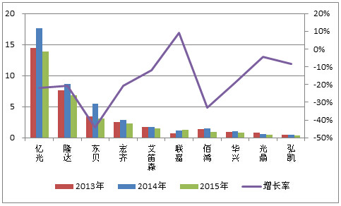 數(shù)據(jù)來源:公司公報GGII整理 三季度10家LED封裝廠總營收同比減少23% 據(jù)GGII統(tǒng)計數(shù)據(jù)顯示,2015年三季度,臺灣10家LED封裝廠總營收達(dá)31.65億,同比減少23%。具體來看,2015年三季度,臺灣10家LED封裝上市企業(yè)中,除聯(lián)嘉外,其余企業(yè)營收均有所下滑,其中,東貝營收下滑幅度最大達(dá)44.1%。 圖32013-2015年三季度臺灣10家LED封裝廠營收情況(單位:億元人民幣,%)