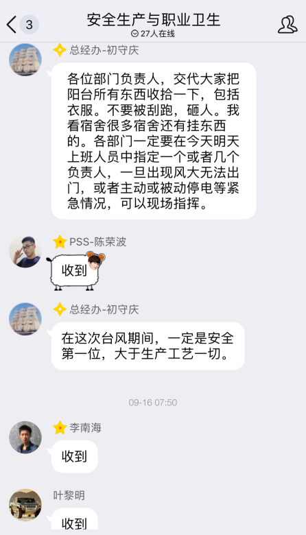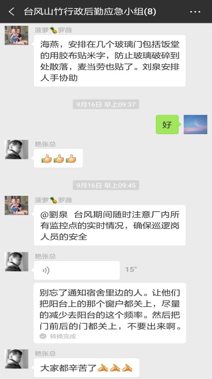 眾志成城,共抗“山竹”;風(fēng)里雨里,感謝有你來源:中圖科技 發(fā)布時間:2018-09-17 點擊:4877 次初秋的九月,臺風(fēng)頻繁造訪的季節(jié)。今年第22號臺風(fēng)“山竹”來勢洶洶,于9月16日17時在廣東臺山登陸,期間東莞市市風(fēng)力最高達11-12級,東莞市氣象部門發(fā)布臺風(fēng)紅色預(yù)警,全市“四停”,進入臺風(fēng)防御緊急狀態(tài)。為確保員工生命財產(chǎn)安全,我們公司進入全面警戒防御狀態(tài)。 一、嚴陣以待,提前預(yù)警,落實責(zé)任 9月15日晚,公司啟動應(yīng)對自然災(zāi)害突發(fā)事件應(yīng)急預(yù)案,成立應(yīng)急小組,針對臺風(fēng)最新動向,全面部署工作,明確各部門、應(yīng)急小組、現(xiàn)場應(yīng)急指揮等人員和職責(zé)。應(yīng)急小組成員開展隱患排查、清點應(yīng)急物資、安排食堂供餐以及制定停水停電應(yīng)急處理措施等,應(yīng)對隨時可能出現(xiàn)的突發(fā)情況,力爭臺風(fēng)到來前防御工作全覆蓋、無疏漏。