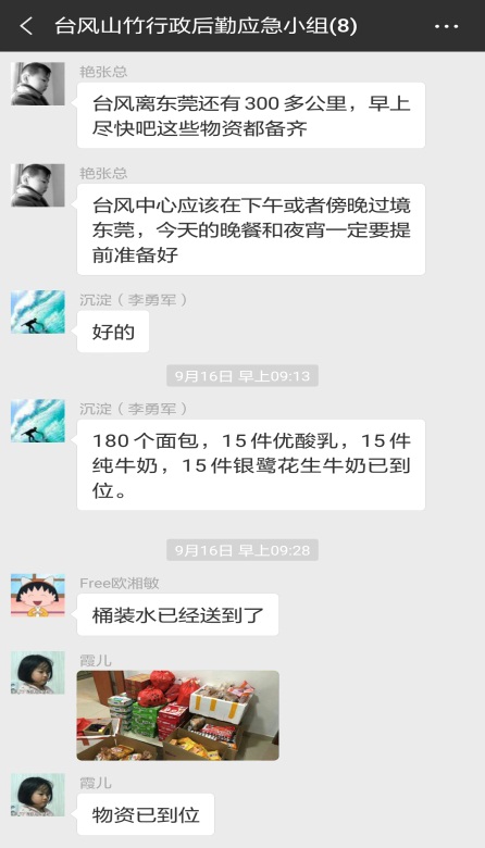 貼米字防強風(fēng) 二、無懼風(fēng)雨,全力以赴,有序落實應(yīng)急指揮機制 公司現(xiàn)場應(yīng)急小組根據(jù)臺風(fēng)實時變化、政府要求、現(xiàn)場狀況作出決定并發(fā)出指令,小組成員即刻行動、有序落實,保障各項應(yīng)急工作落實到位。 應(yīng)急物資采購 三、戮力同心,眾志成城,全員出動搶險保平安 公司有車的同事積極響應(yīng)號召,在大雨中一次又一次往返, 把員工安全地轉(zhuǎn)移至飯?zhí)镁筒停?/span> 不少同事下班時也主動送外宿的員工回家 打包宵夜送至各區(qū),解決員工就餐問題