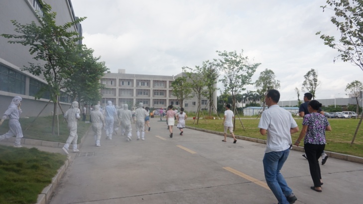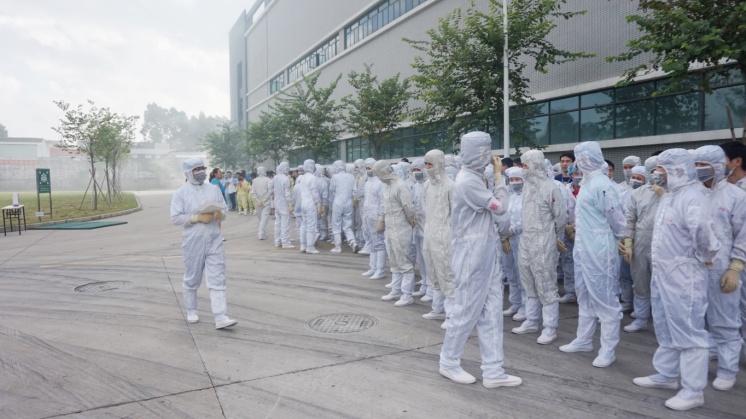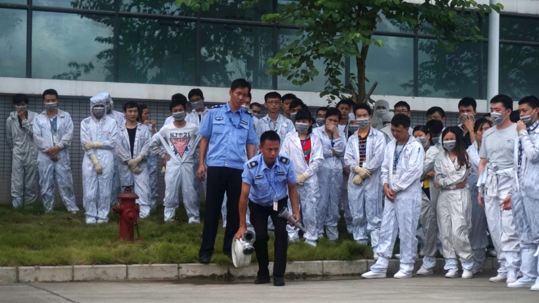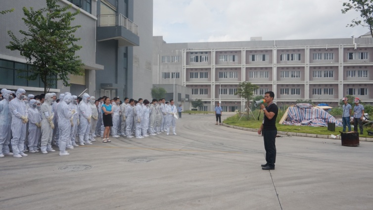 早上8:10,隨著煙霧彈燃起、消防報警系統(tǒng)拉響,全體在崗人員在疏散組成員的引導(dǎo)下成功到達緊急集合點。