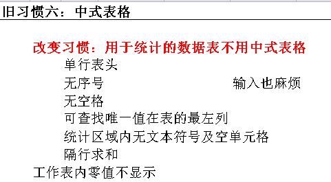 通用類培訓(xùn)-《Excel應(yīng)用》來源:中圖科技 發(fā)布時間:2016-12-17 點(diǎn)擊:4092 次12月17日,公司開展了通用類課程培訓(xùn)——《Excel應(yīng)用》。Excel可以進(jìn)行各種數(shù)據(jù)的處理、統(tǒng)計分析和輔助決策操作,廣泛地應(yīng)用于管理、統(tǒng)計財經(jīng)、金融等眾多領(lǐng)域。Excel通用便利,簡直是辦公神器。但是對于Excel的應(yīng)用,你們又知道多少呢?這次培訓(xùn),行政人事部的網(wǎng)絡(luò)工程師葉方軍給大家?guī)砹薊xcel“更深層”的知識。 阿軍首先給大家羅列了使用excel的十大舊習(xí)慣——1、文本數(shù)字不分列;2、手寫式錄入;3、手工標(biāo)注顏色;4、合并單元格;5、簡稱全稱并用;6、中式表格;7、同類內(nèi)容分多列;8、表內(nèi)表;9、分表分簿;10、先單后表?;谶@些舊習(xí)慣,阿軍精心準(zhǔn)備了大量資料,逐個逐個給大家拆解。下面,小編給大家偷師分享新舊習(xí)慣大對比—— 錯過了培訓(xùn)的小伙伴可以到公共區(qū)Y盤自取課件學(xué)習(xí),還有更多的干貨等著你哦!