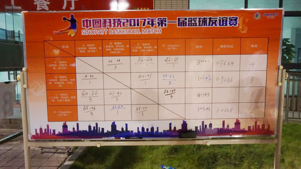 隨后,一段歡快高昂的運(yùn)動會進(jìn)行曲開了開幕式的序幕,在人們的掌聲中,主持人登場宣布開幕式正式開始。本次籃球賽共有4支隊(duì)伍參賽,分別是藍(lán)精靈隊(duì)(品管部、銷售部、采購部、動力部)、圖騰隊(duì)(設(shè)備部、財(cái)務(wù)部、市場部、貿(mào)易公司、PMC部)、冠軍隊(duì)(工藝部、項(xiàng)目部、研發(fā)部、行政人事部)、Sapphire隊(duì)(生產(chǎn)部)。