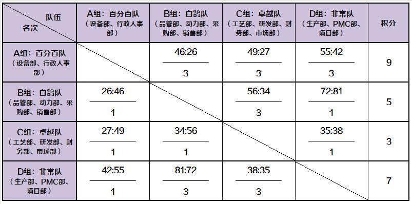 本次比賽歷時3周,共舉行了6場賽事,采用循環(huán)賽制,參加本次籃球賽的隊(duì)伍共有4支,他們是百分百隊(duì)(設(shè)備部、行政人事部)、白鵠隊(duì)(品管部、動力部、采購部、銷售部)、卓越隊(duì)(工藝部、研發(fā)部、財(cái)務(wù)部、市場部)、以及非常隊(duì)(生產(chǎn)部、PMC部、項(xiàng)目部)。