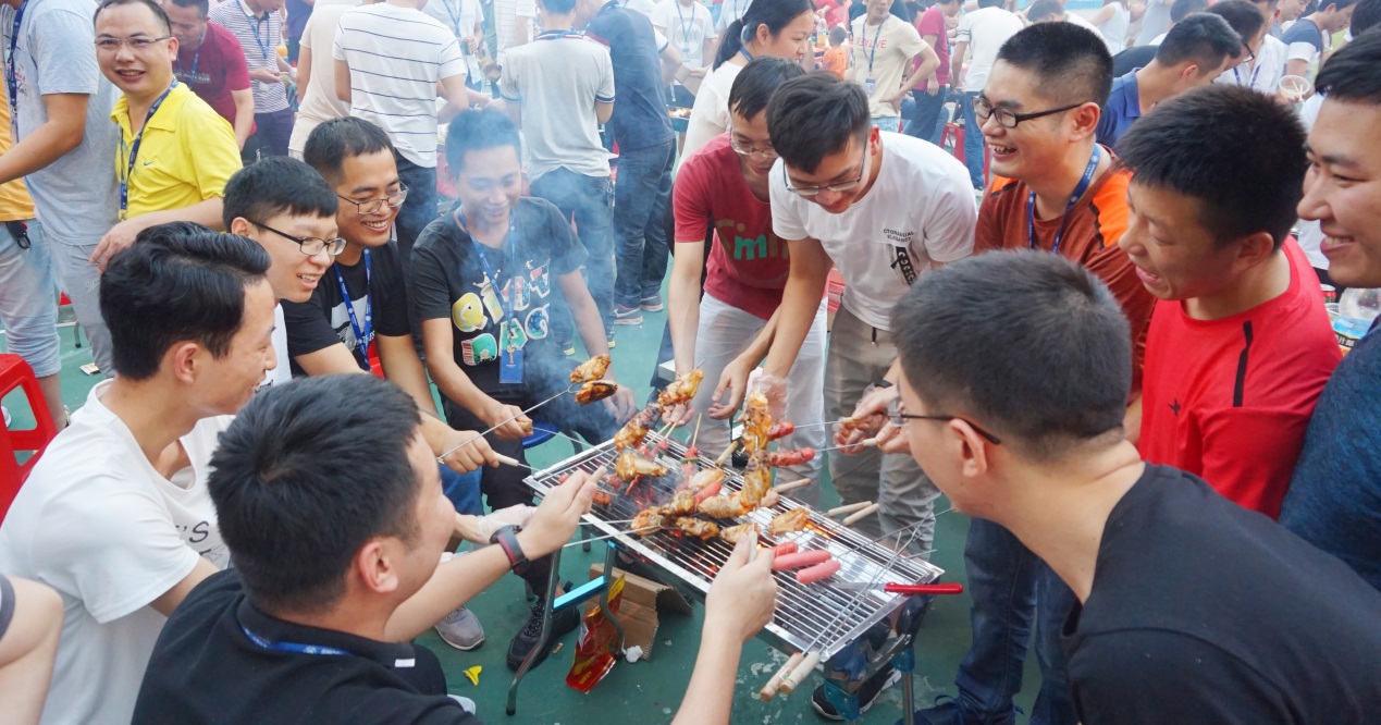 在歌唱比賽正式開始前,下午17:30,同事們陸續(xù)來到活動中心開始燒烤。大家親自動手,分工明確,有人生火,有人串制食物,配合默契,忙得不亦樂乎!當(dāng)炭火點燃,燒烤正式拉開了帷幕。大家展示了不同的燒烤方法和技藝。歡聲笑語隨著縷縷炊煙縈繞在空中,大家吃著自己親手烤出的各種食物,聊著自己在工作和生活中遇到的各種趣事,其樂融融!
