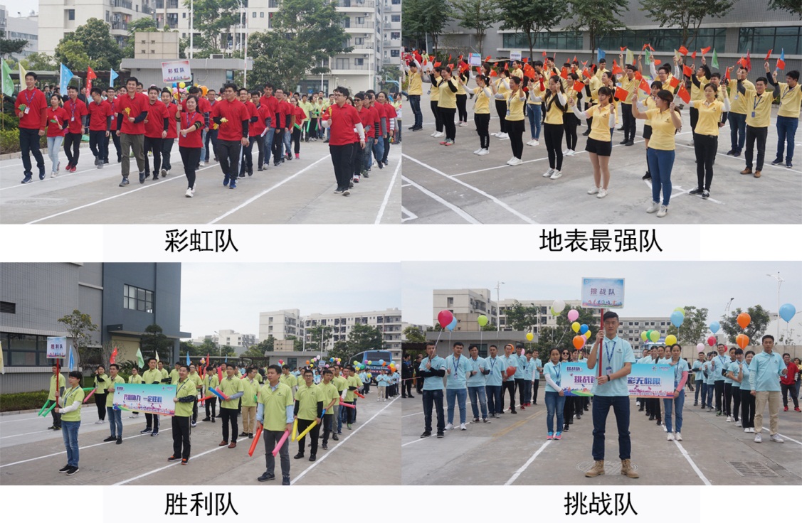 ![]() 本次運動會共有四支隊伍參加——彩虹隊(品管部、工藝部、研發(fā)部、動力部、財務(wù)部、項目部)、地表最強(qiáng)隊(生產(chǎn)部A、B區(qū)及生產(chǎn)部辦公室員工、PMC部)、勝利隊(總經(jīng)辦、設(shè)備部、銷售部、市場部、采購部、行政人事部)以及挑戰(zhàn)隊(生產(chǎn)部C區(qū)、生產(chǎn)部E區(qū))。
