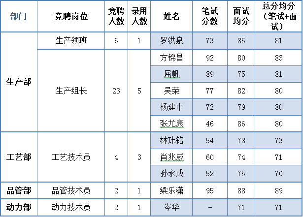 經(jīng)用人部門及行政人事部對(duì)各崗位“人崗匹配”進(jìn)行綜合評(píng)議后,現(xiàn)將競(jìng)聘結(jié)果公布如下: