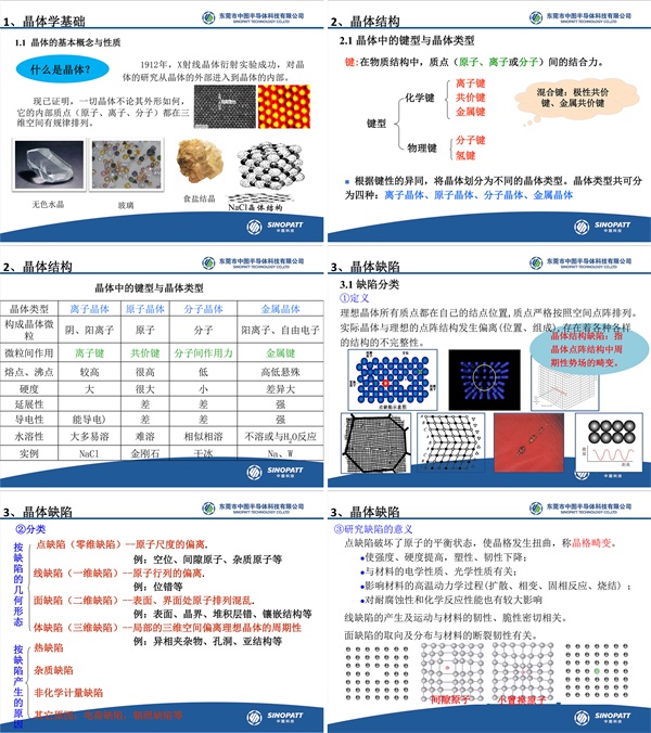 此次培訓(xùn)王主管從晶體學(xué)基礎(chǔ)、晶體結(jié)構(gòu)以及晶體缺陷三個(gè)方面進(jìn)行講解,幫助學(xué)員理解何為晶體以及晶體的一些基本特征,并結(jié)合公司產(chǎn)品進(jìn)行闡釋,讓大家更深入的理解我司所生產(chǎn)的產(chǎn)品的特性以及產(chǎn)品與上下游技術(shù)指標(biāo)之間的關(guān)系。
