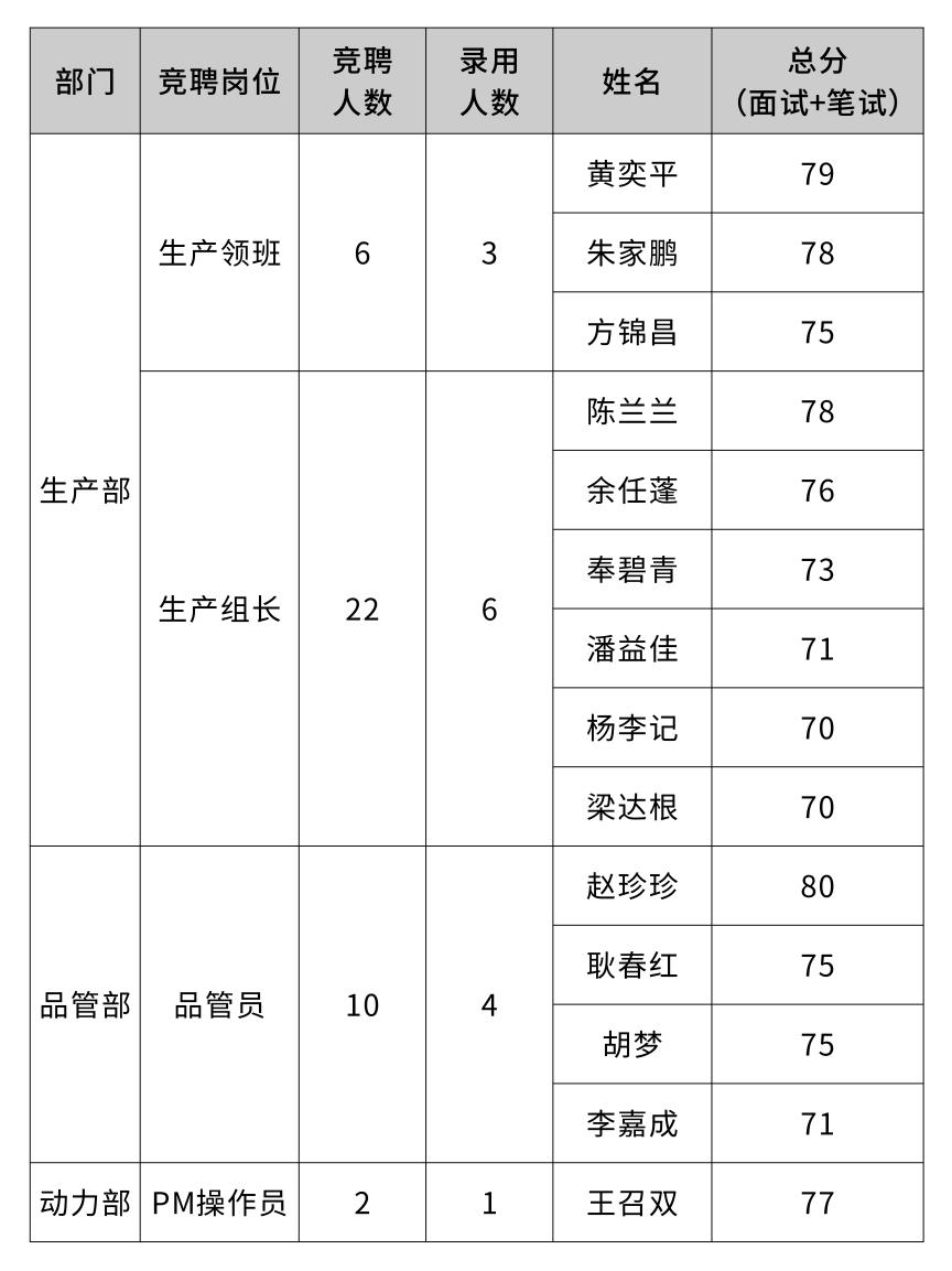 根據(jù)評(píng)審結(jié)果,綜合考慮現(xiàn)階段部門(mén)實(shí)際需求及筆試、面試情況,現(xiàn)將競(jìng)聘結(jié)果公示如下: ![]() 本次內(nèi)部競(jìng)聘活動(dòng),促進(jìn)員工自我提升、公司人才選拔,形成公司內(nèi)部人才資源庫(kù),源源不斷地為企業(yè)發(fā)展注入內(nèi)生動(dòng)力!